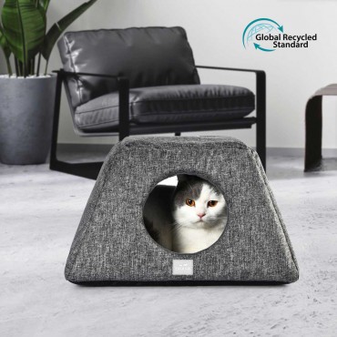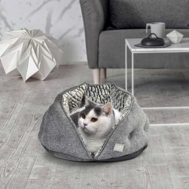 Linen Fur-Lined Grey Cosy Warm Cat Bed Grey Cat BedDescriptionDesigned for anxious or easily scared cats. A Cosy warm cat bed with a comfy shape and a luxury cat bed fur lining to help relieve anxiety and create a calming atmosphere for sleep by giving the perfect space for your cat to curl up, hide & keep warm.FeaturesPRIVACY & SECURITY. The high sides of this modern cat bed design pro..