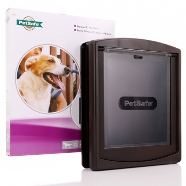 Staywell Large Dog Door Brown - by Petsafe 775Description Large Brown Pet Door Brown finish with See Through Flap. Lockable security barrier. Supplied with tunnel extension for door thickness up to 2". Suitable for any thickness of walls and doors but liner, e.g. soffit board, required Dimensions Overall size: 468mm x 391mm Cut out size: 370mm x 314mm Pet Max shoulder width: 290mm Ord..